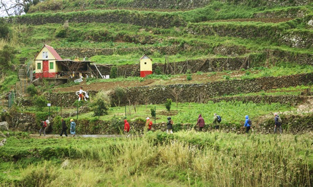 The setting is magnificent! Walk through cultivated terraces on a flower lined Levada that winds along an escarpment with breathtaking views: the high peaks inland and the Penha da Águia (Eagle’s Rock) standing proudly on the edge of the Ocean and over the picturesque fishing village of Porto da Cruz.